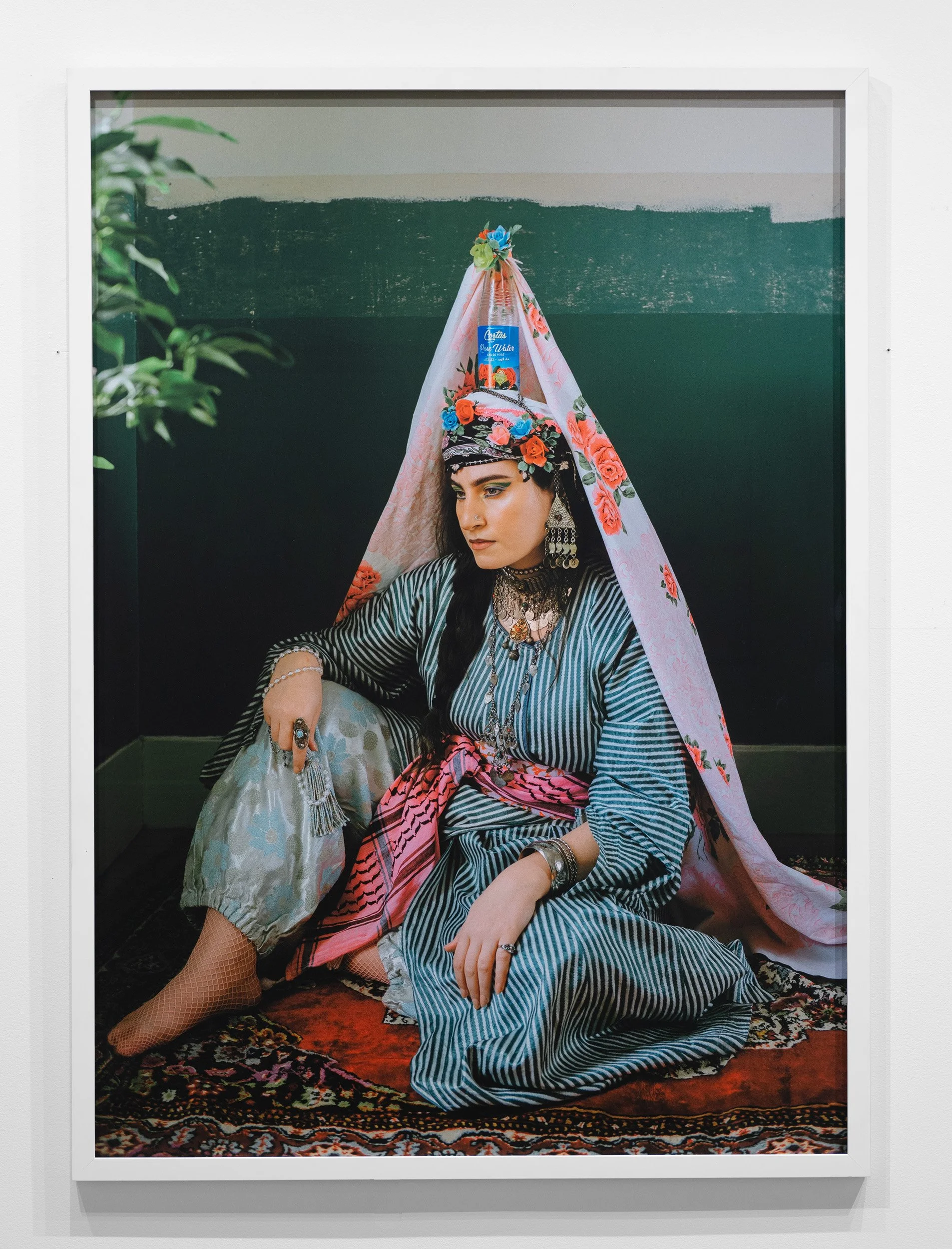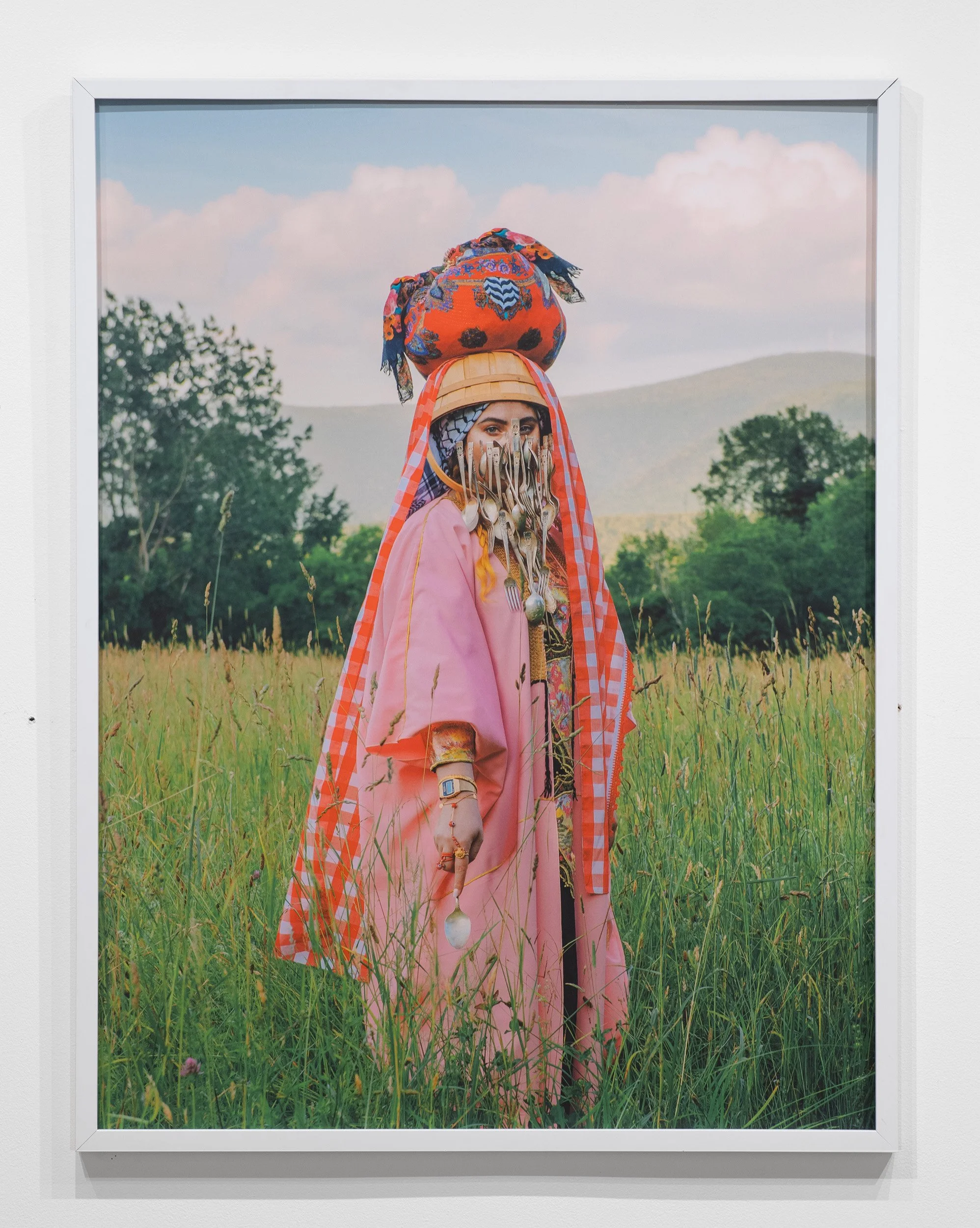 In her series, “Made in USA, صنع في أمريكا,” Eid utilizes upcycled materials from thrift stores, found objects, and heirloom jewelry to reenvision scenes from the Middle East’s Levant region. Creating bold and vibrant self-portraits in a red white and blue color palette, Eid explores her Muslim Arab identity while challenging the gaze of 19th and early 20th century European orientalist photographers, whose works are referenced and researched by Eid.