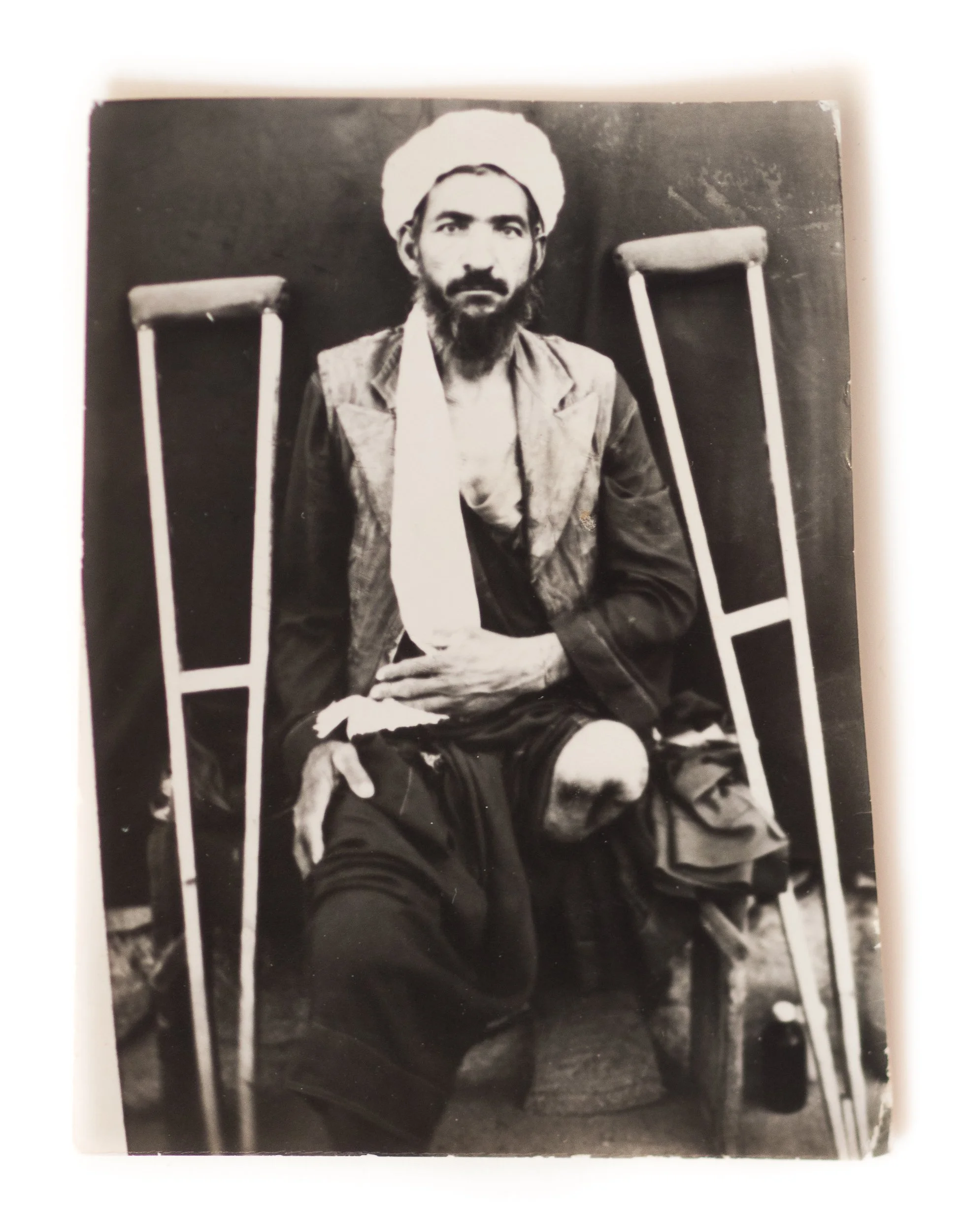In 1990 Haji Mullah Akhond, a Mullah in Kandahar, established a foundation to help those who had become victims of the Soviet war in Afghanistan: orphans, disabled Mujahideen fighters, and civilians wounded by land mines and other explosives. Hadi, with assistance from his father, a former general in the Afghan army, was hired by Mullah Akhond to document those who had been wounded. By this time the 11-year old Hadi was an experienced photographer using a handmade wooden box camera, a widely popular tool in Afghanistan for making street portraits for money. Over the course of two years, Hadi would go on to photograph more than 10,000 people who had been wounded while managing the record keeping of those who had received funds from the Saudi-backed foundation.